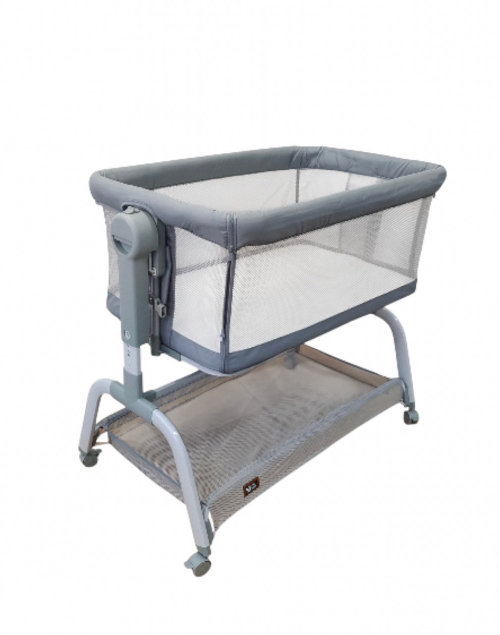 - Трансформируемая конструкция: Благодаря открывающемуся переднему борту кроватка легко превращается в приставную систему, фиксируясь рядом с родителями.